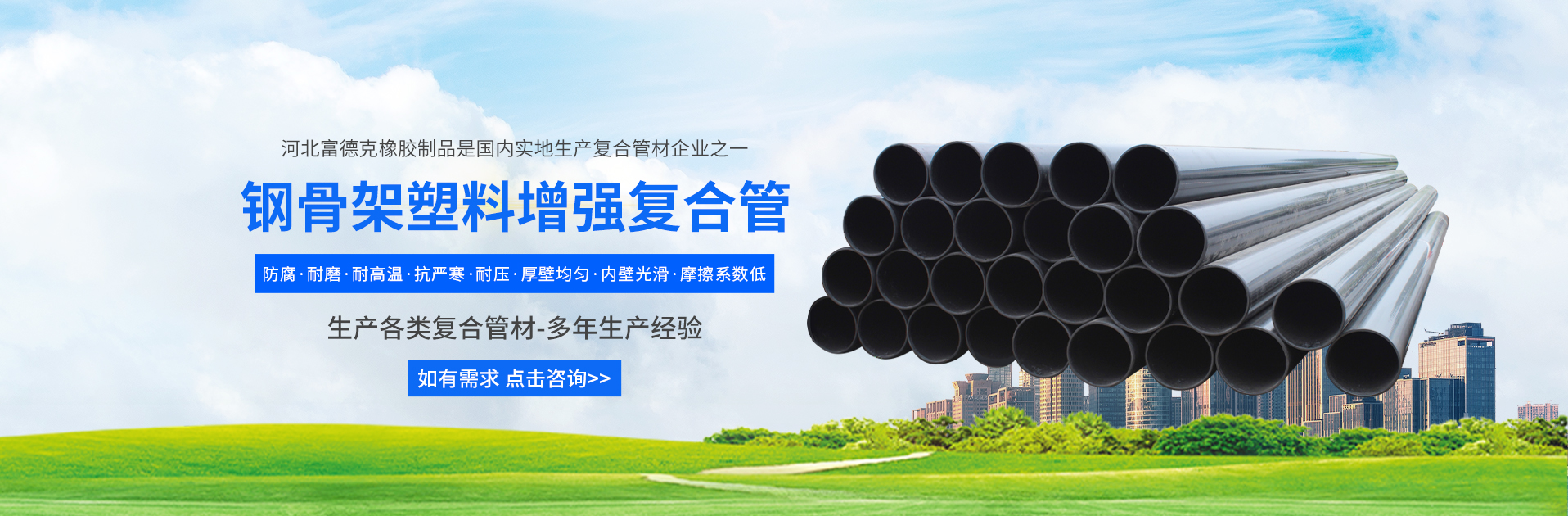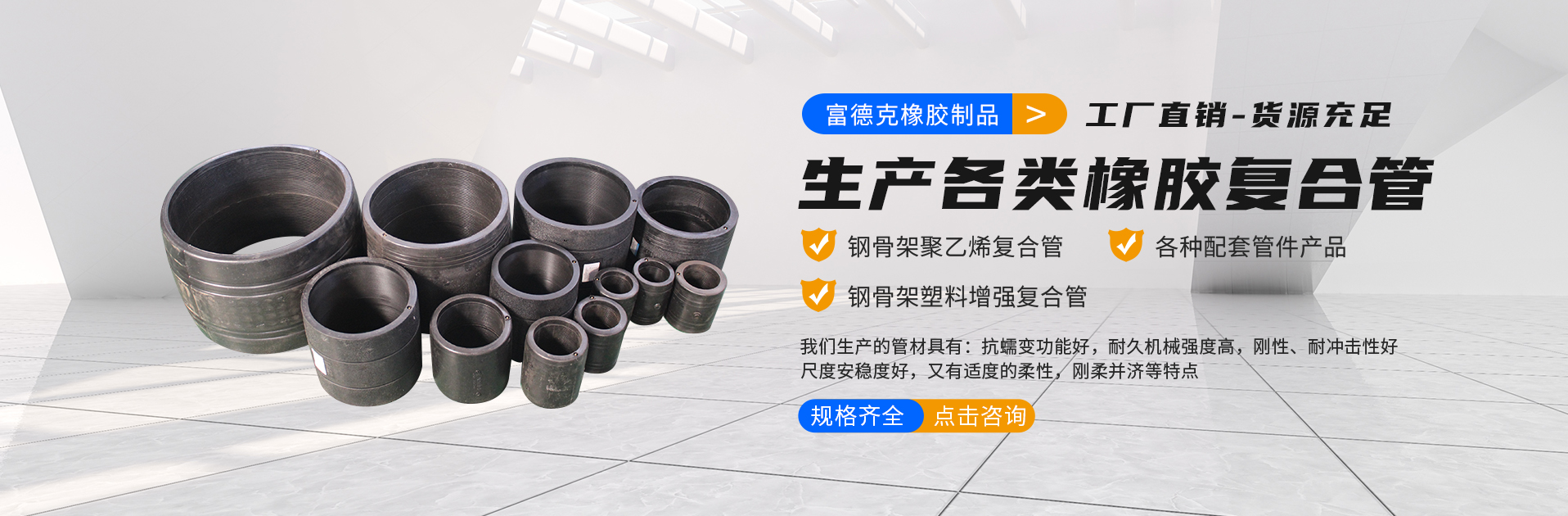 河北富德克橡膠制品有限公司,始建于2013年,座落于千年古城--河北景縣城南開(kāi)發(fā)區(qū),公司占地面積3.8萬(wàn)平,注冊(cè)資金6200萬(wàn),廠(chǎng)區(qū)公司成立以來(lái)專(zhuān)注于鋼骨架聚乙烯復(fù)合管設(shè)備研發(fā)及管材的生產(chǎn),現(xiàn)有員工228名,其中高級(jí)工程師3名,中級(jí)工程師10名,技術(shù)人員18名,年產(chǎn)值達(dá)1.2億。公司專(zhuān)業(yè)生產(chǎn)鋼骨架聚乙烯復(fù)合管、HDPE雙壁波紋管、PE鋼塑復(fù)合管、配套管件、液壓軟管、輸水膠管、金屬軟管、膨脹節(jié)、補(bǔ)償器、橡膠接頭、金屬接頭、管件、輸送機(jī)械及配件、穿線(xiàn)管、四氟產(chǎn)品、復(fù)合軟管、濾芯、礦山配件、止水材料、···